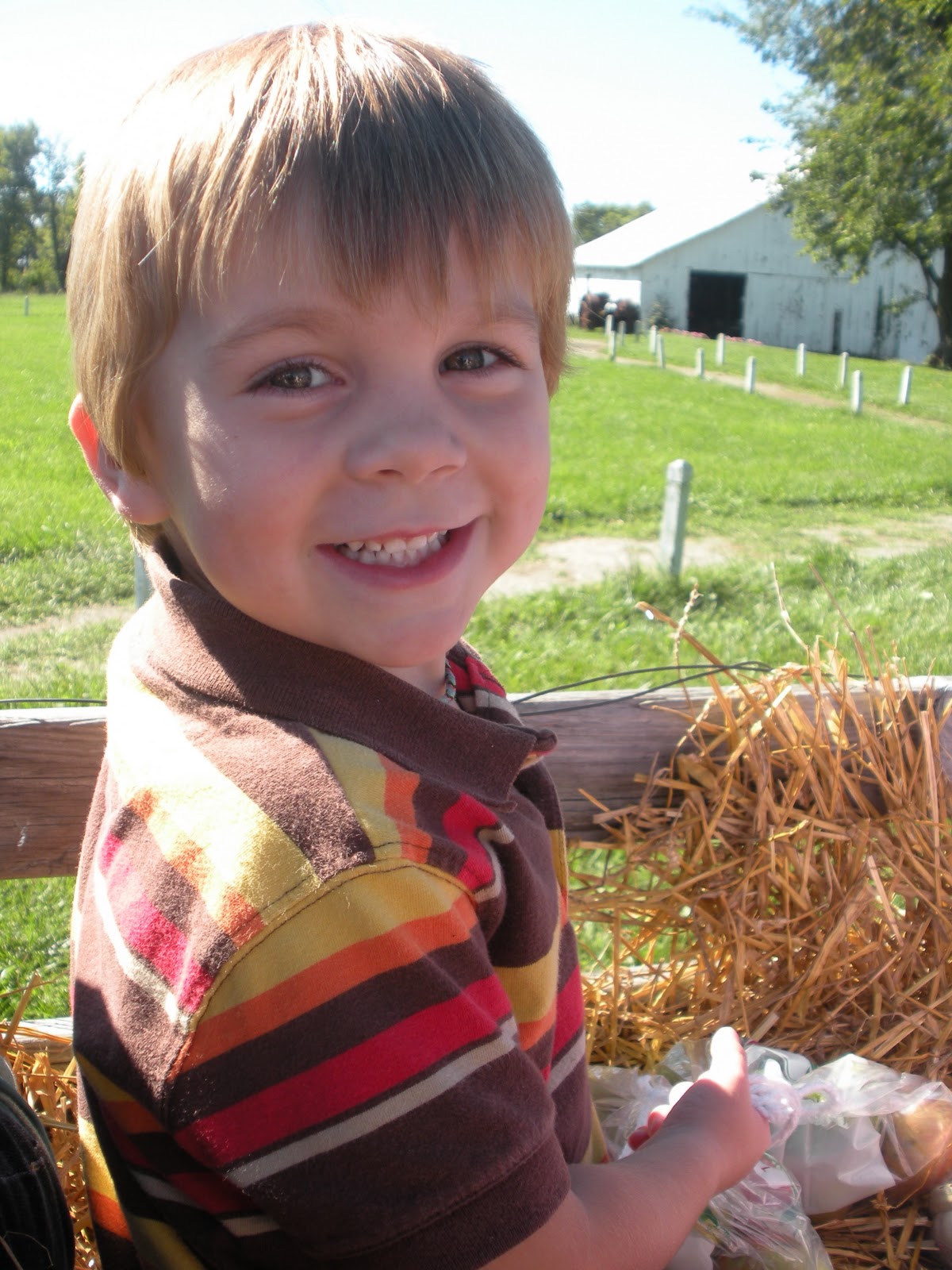 Ben has been waiting and waiting for the trip to the apple orchard with our playgroup. Today was the day and 10:30 could not come early enough for him! We had a great time picking apples and going on the hayride. A beekeeper taught the kids all about bees and then showed us a real hive! Ben loved the farm animals, too, especially the little kitties. It was a beautiful morning to spend outside with friends!