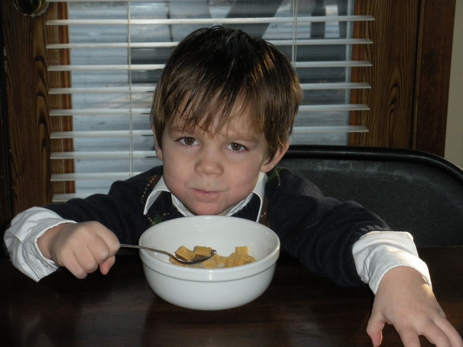 I love this picture! Ben wasn't thrilled in the least about mom pulling out the camera. He didn't care about the toothpaste dribbles on his pants/hair and he certainly wasn't going to tuck in his shirt or pull down the sleeves of his sweater to make himself a little more presentable. I managed to get this giggle by going against everything I know to be right when I said to him, "Hey Ben, I think Nick tooted..." The things we do sometimes......